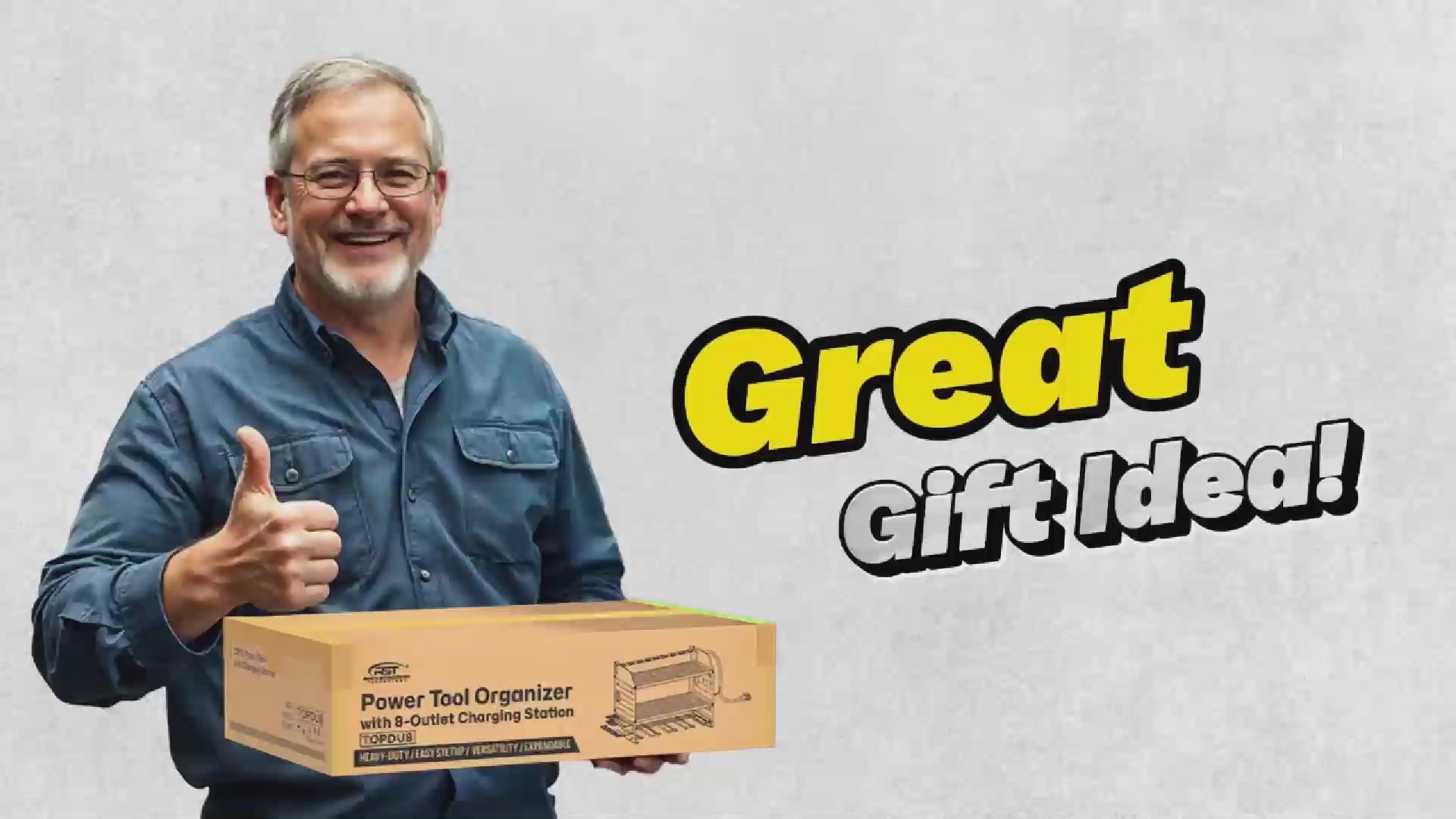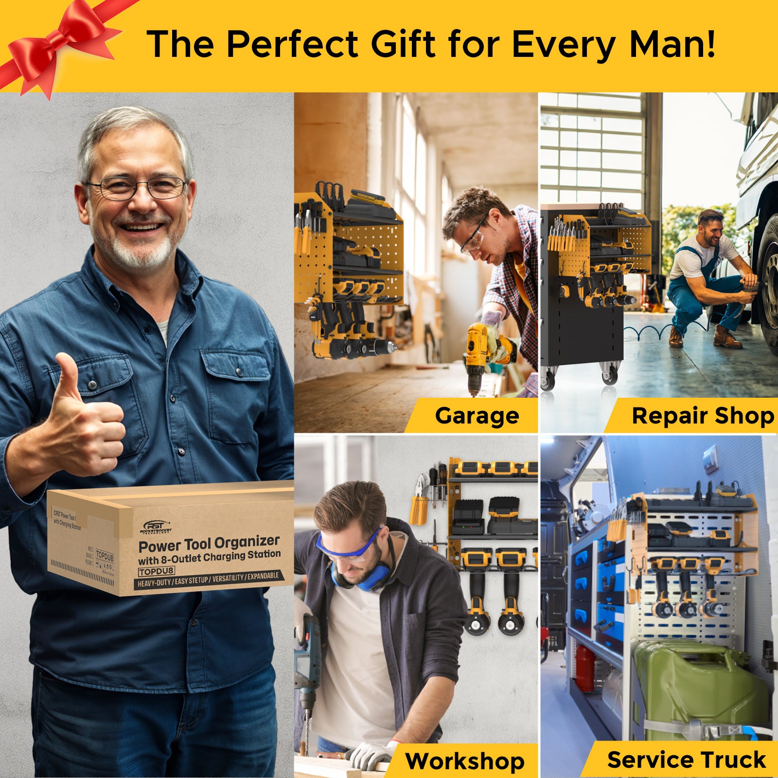• ALL-IN-ONE POWER TOOL ORGANIZER WITH INDIVIDUAL SWITCHES: Combines tool storage, charging station, and pegboard. Features an 8-outlet individual switched heavy-duty power strip (SGS certified, 2100J surge protection) and drill organizer wall mount. Maximize energy efficiency and safety by controlling each tool's power independently. Perfect for garage organization and workshop efficiency