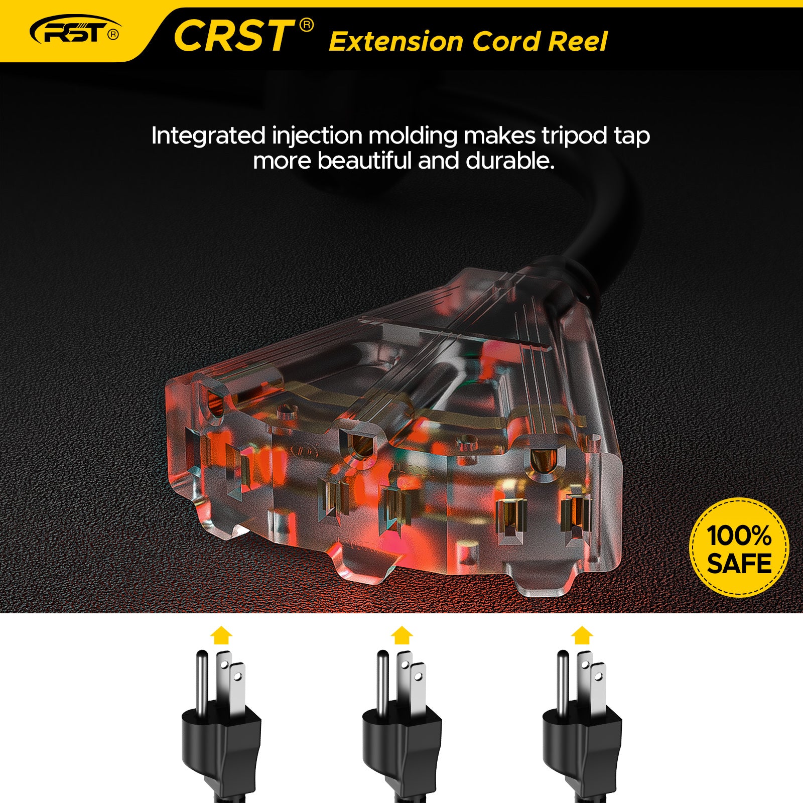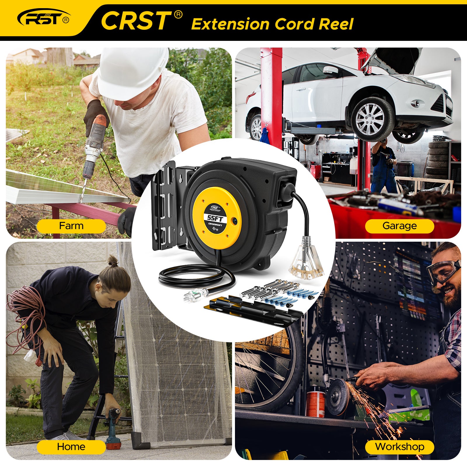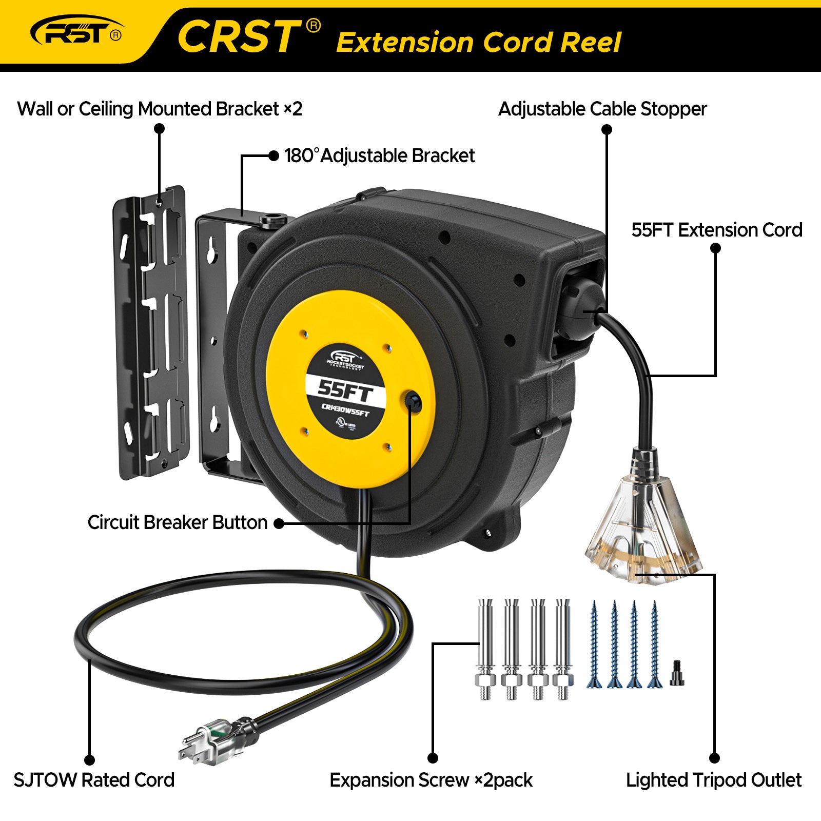 CRST 55FT Retractable Extension Power Cord Reel with Mounting Kits, Lighted 3 Outlets Tap, UL Listed