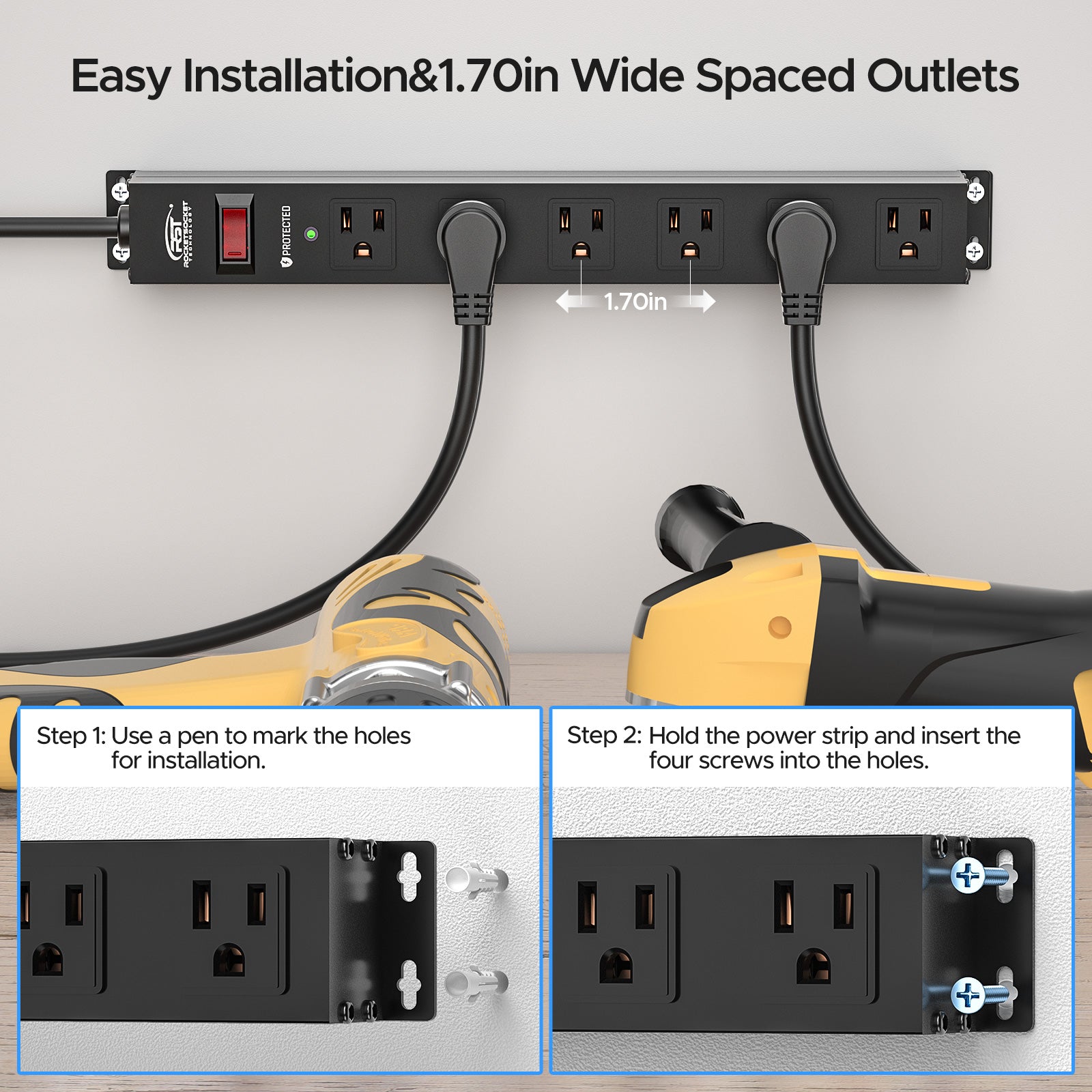 • Wide-spaced 1.7-inch center-to-center outlets fit bulky plugs. The 45° angled flat plug and mounting slots enhance usability. This design brings convenience and detail to your setup.